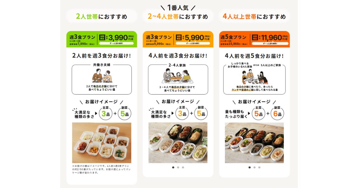 | 週3食プラン | 2人前を週3食分(主菜3品、副菜5品) |